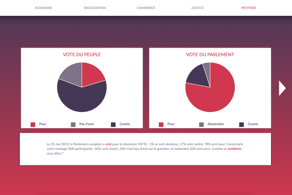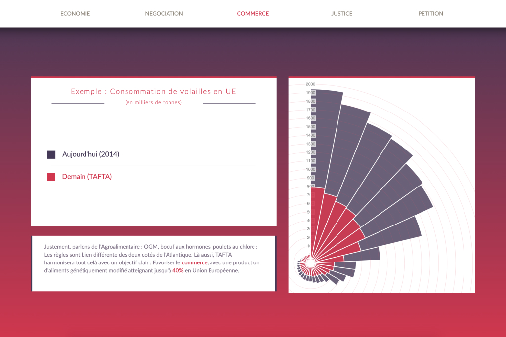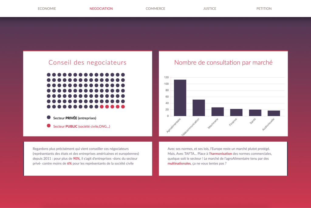 Raise awareness, sensitize through data visualization on a subject still unknown to many of us, the TTIP (Transatlantic Trade and Investment Partnership). Why TTIP? Because every European should know what fate awaits them if such an agreement were to be approved.